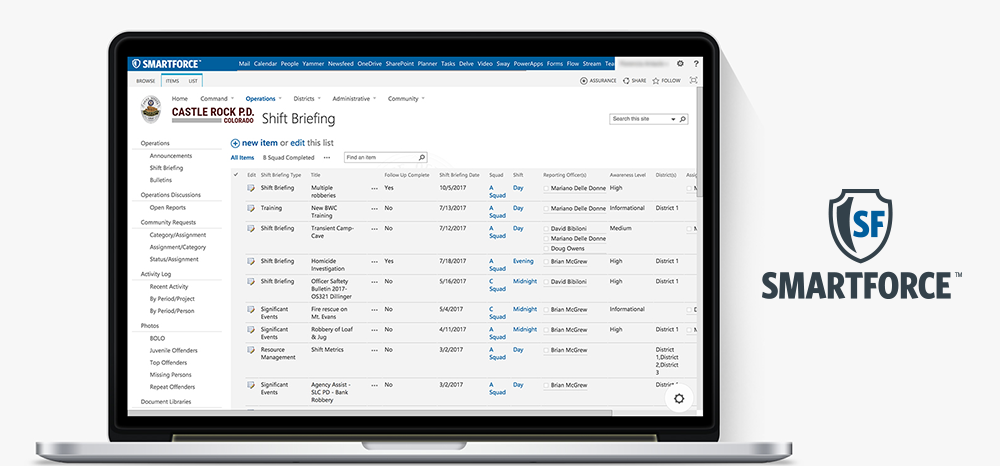 SmartForce can be used for the sharing of information and intelligence in ALL situations – from the routine shift briefing to the complex operation, from crime stats to major crimes investigations. These are the types of benefits that we want to help your entire organization enjoy here at Adventos. With a secure collaboration environment, everyone in the organization can be sure of their role and see relevant information. You will improve accountability in your agency and speed up crime reduction strategies.