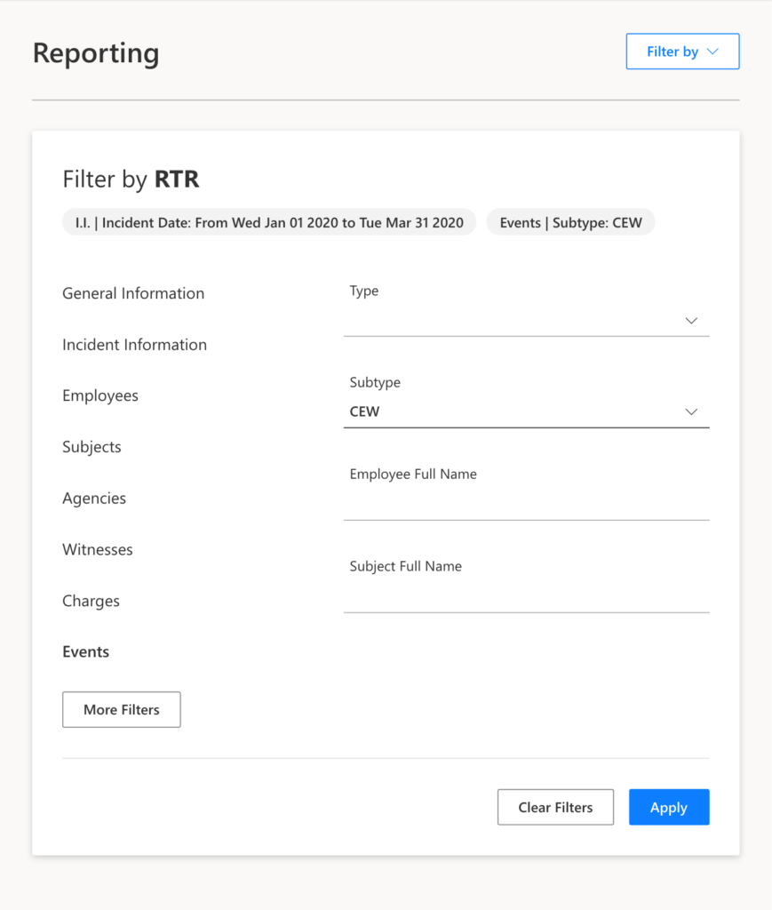 For this first version, we started with Use of Force reports gathered from our Response to Resistance application. After the reports pass the Supervision levels, the personnel who is allowed to access The Reporting System will be able to filter their data deeply.